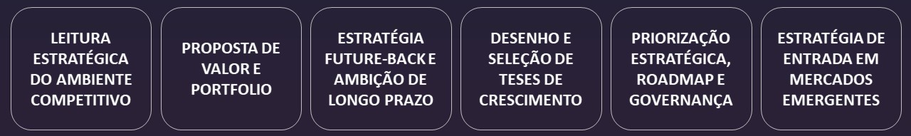 Uso de cenários e future-back para redefinição de ambição, portfólio e posicionamento competitivo.